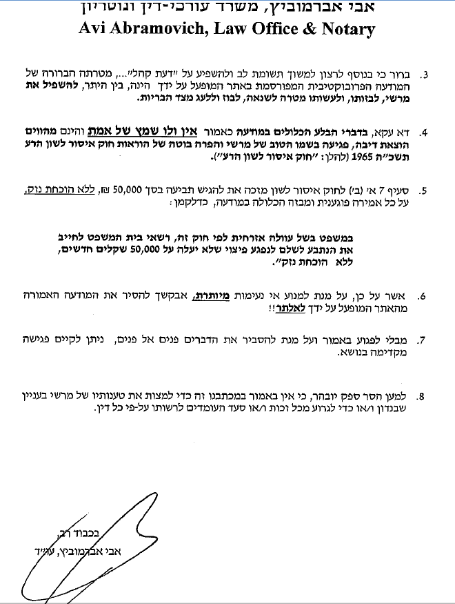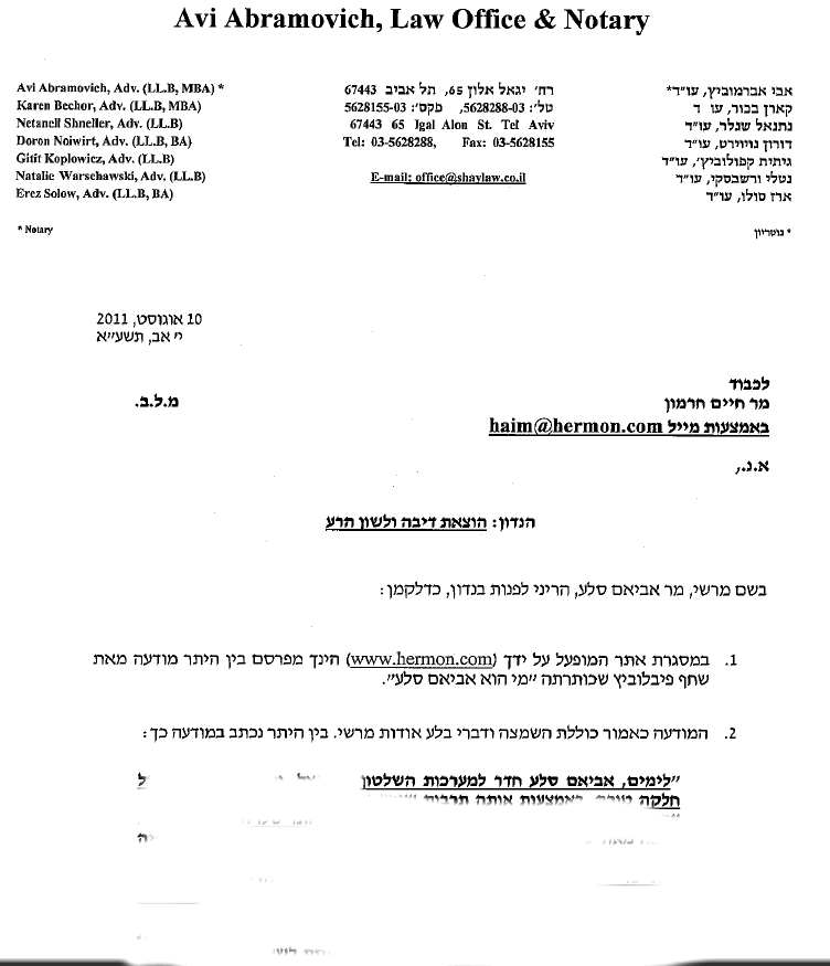 להלן מכתב שקיבלתי היום - עשירי לאוגוסט 2011